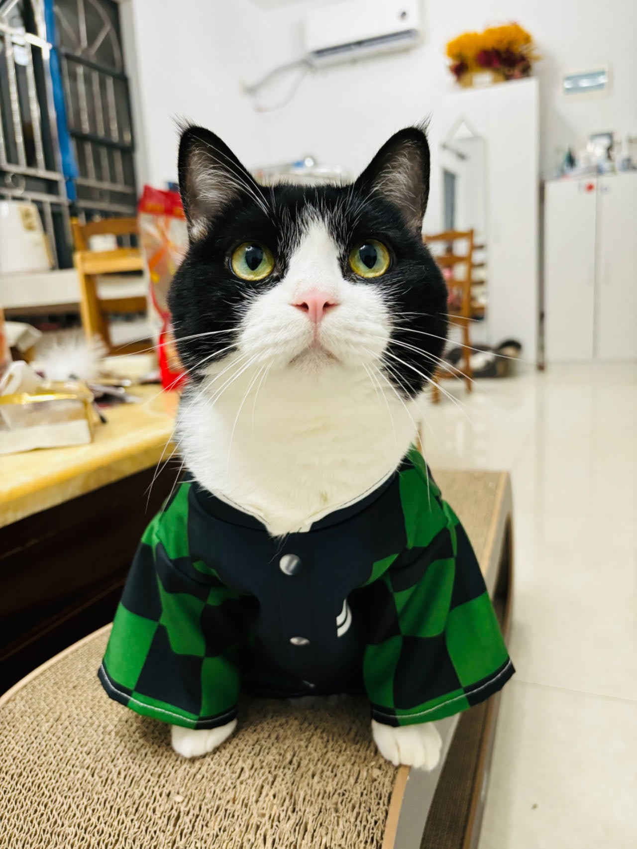 Emulating Tanjiro Kamado's iconic haori, the cloak features a striking checkered pattern that captures the essence of the character's look. The attention to detail extends to the vibrant colors and traditional Japanese cut, making your pet a standout star wherever you go.